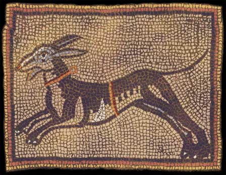 これを考えた時には古代ローマがマイブームで、「そういえばオリエント美術館に犬のモザイクあったっけ」と思い出して描いたものです。ローマっていうかビザンティンですが。